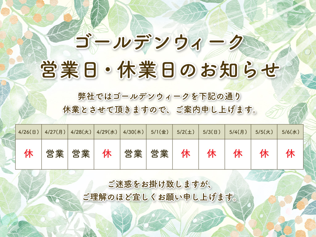 さて、誠に勝手ながら、弊社ではゴールデンウィーク期間中の営業を下記の通りとさせていただきます。