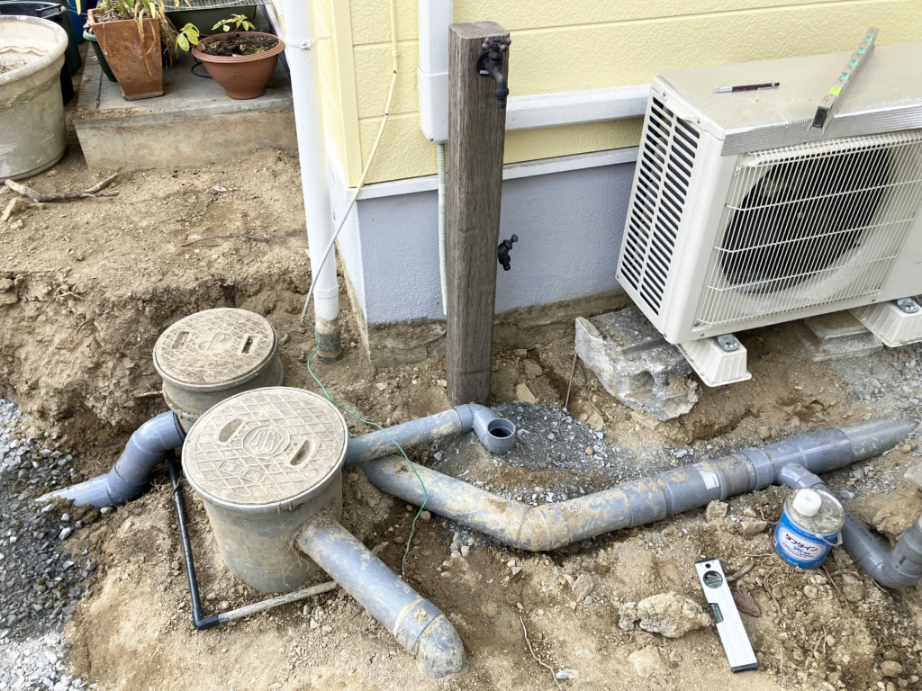 掘削後、低くなった庭の高さに合わせて水回りの工事を実施。