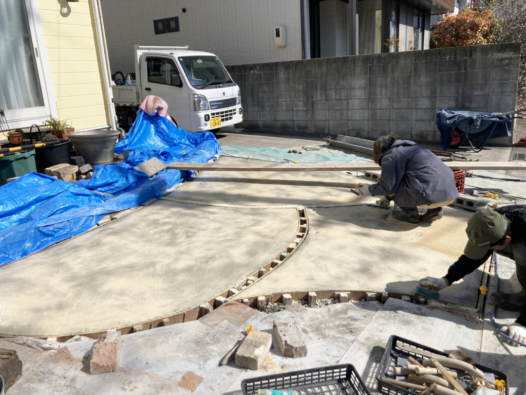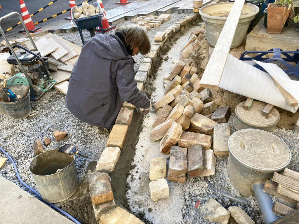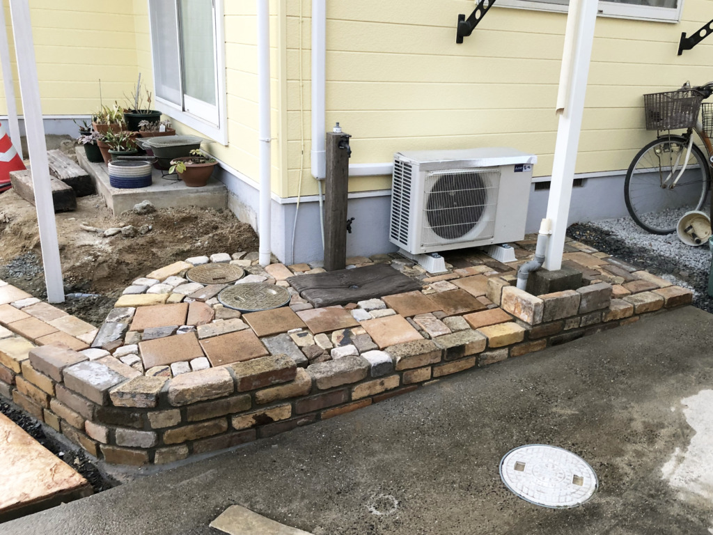 以前のお庭で使用されていた既存のアンティークレンガを再利用して、